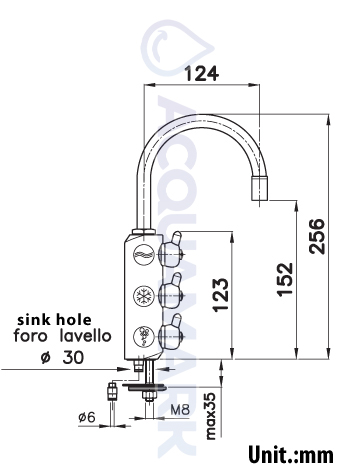 Il rubinetto di prelievo Acquamark 3032 a 3 vie è progettato per l’erogazione dell’acqua depurata proveniente da impianti di filtrazione e osmosi inversa.