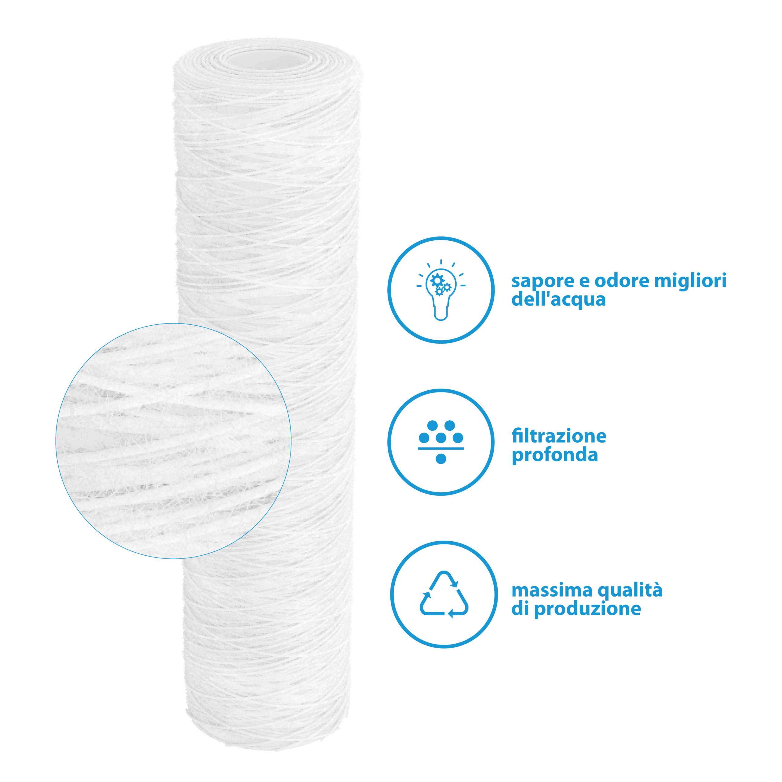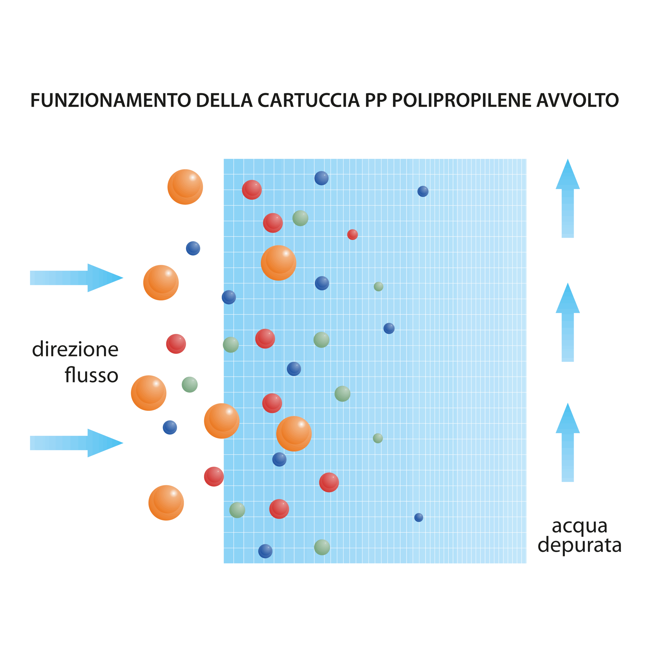 Le cartucce sono realizzate con filato di polipropilene di altissima qualità, la densità delle fibre aumenta