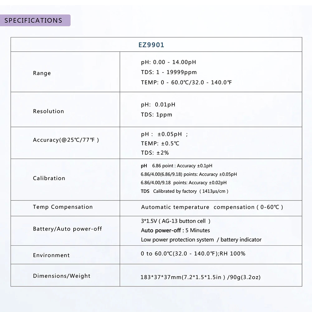 Vasta gamma di applicazioni: ideale sia per uso casalingo che all’interno di laboratori specializzati per testare il Ph dell’acqua potabile, delle piscine, degli acquari, delle colture idroponiche, ecc.